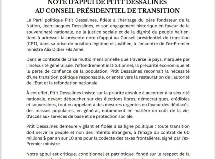 Le parti politique Pitit Dessalines a publié une note d’appui au Conseil présidentiel de transition (CPT) dans...