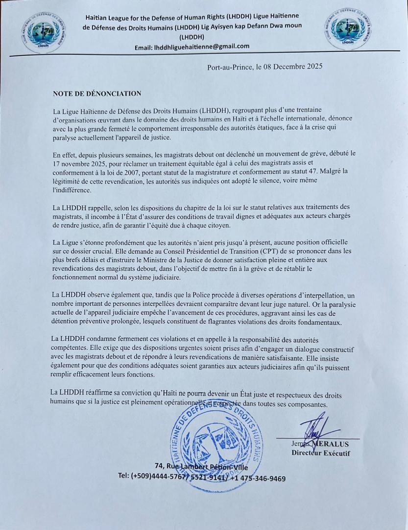 Dans une note rendue publique ce 8 décembre 2025, la Ligue haïtienne de Défense des Droits humains (LHDDH), regroupant plus d’une trentaine d’organisations, dénonce avec fermeté l’attitude qu’elle qualifie d’irresponsable de la part des autorités étatiques, lesquelles laissent s’envenimer une situation déjà critique au sein de l’appareil judiciaire.