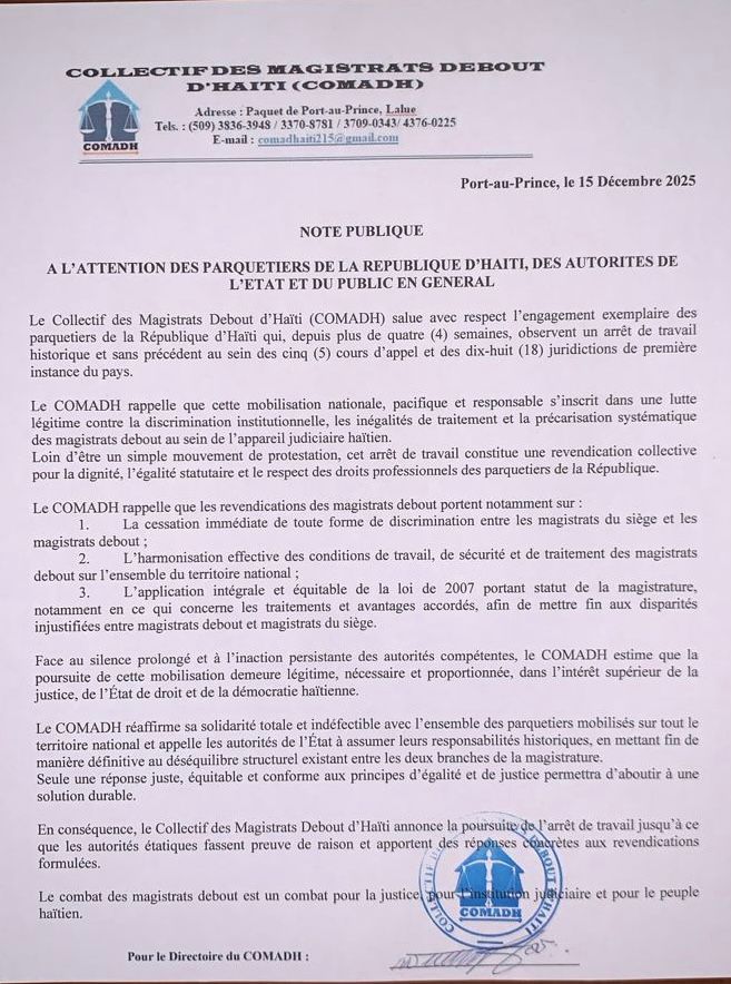 Dans une note publique, le Collectif des Magistrats Debout d’Haïti (COMADH) lance un appel pressant aux autorités judiciaires, aux représentants de l’État et à la Société civile. À travers ce document, le collectif salue la mobilisation sans précédent des substituts du Commissaire du gouvernement dans les cinq Cours d’appel et les dix-huit juridictions de première Instance du pays, engagés dans un mouvement légitime pour la justice interne.