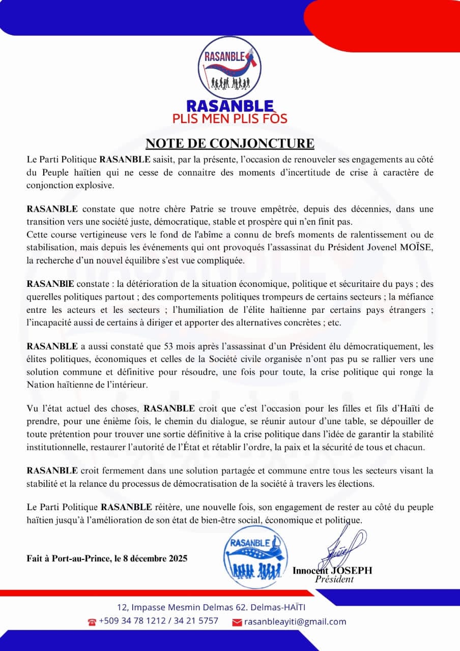 Face à l’aggravation continue de la crise politique, économique et sécuritaire en Haïti, le parti politique RASANBLE a publié, le 8 décembre 2025, une note de conjoncture dans laquelle il renouvelle son engagement aux côtés du peuple haïtien et appelle à une solution collective durable à l’impasse actuelle.