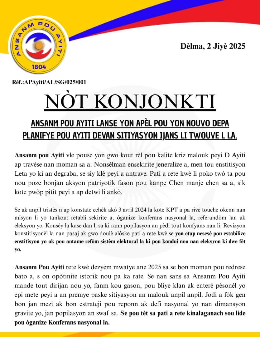 Dans cette dynamique, Ansanm Pou Ayiti invite l’ensemble des citoyens, au-delà des intérêts personnels ou de genre, à s’unir autour d’une stratégie nationale forte et inclusive. Le message est clair : « Se pou tèt sa, pati a rete kinalaganach sou lide pou òganize Konferans Nasyonal la. »