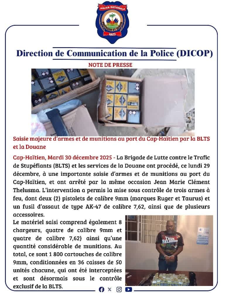 Une opération conjointe menée ce lundi 29 décembre 2025 par des agents de la Brigade de Lutte contre le Trafic de Stupéfiants (BLTS) et les services de la douane s’est soldée par la saisie d’armes et de munitions au port du Cap-Haïtien. Un individu répondant au nom de Jean Marie Clément Thélusma a été interpellé lors de l’intervention.