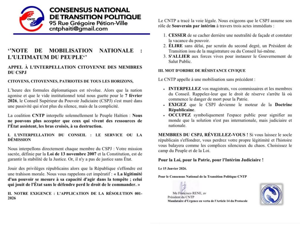 Dans ce document, la coalition exprime ses préoccupations face à ce qu’elle considère comme un risque imminent de vide institutionnel, imputé notamment à l’absence d’initiatives du CSPJ. Selon la CNTP, le Conseil, garant du bon fonctionnement du pouvoir judiciaire, ne peut demeurer en retrait dans un contexte de crise généralisée de l’État.