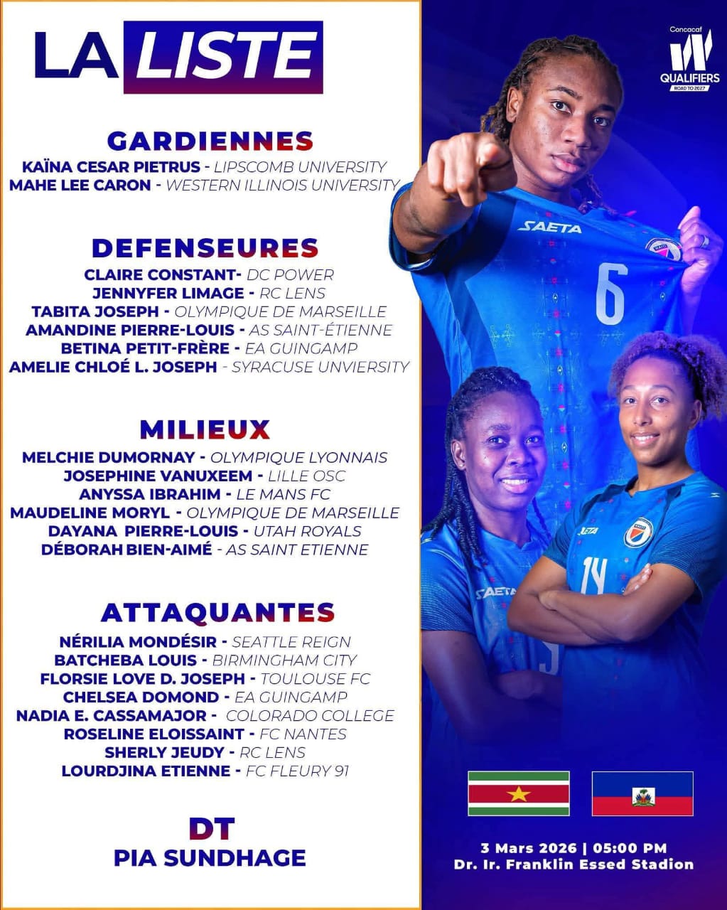 La sélection haïtienne féminine s’apprête à écrire un nouveau chapitre de son histoire. Pour affronter le Suriname, la nouvelle sélectionneure, Pia Sundhage, en collaboration avec la Fédération Haïtienne de Football, a publié une liste de 22 joueuses convoquées. Parmi les cadres retenues figurent Chloé Joseph et Joséphine Vanuxeem, appelées à apporter leur expérience et leur stabilité au sein du groupe dans ce rendez-vous important.