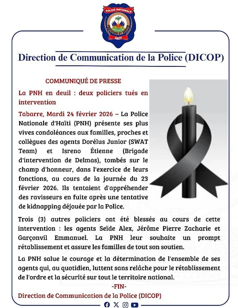 Dans un communiqué publié le mardi 24 février 2026, la Direction de Communication de la Police (DICOP) informe que les agents Dorélus Junior, membre du SWAT Team, et Isreno Étienne, affecté à la Brigade d’intervention de Delmas, sont tombés dans l’exercice de leurs fonctions.