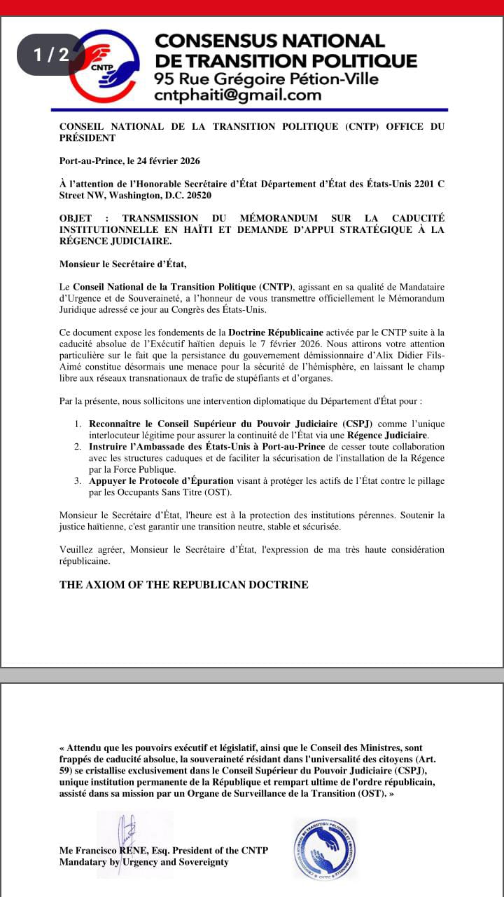 Dans une correspondance officielle datée du 24 février 2026 et adressée au Département d’État des États-Unis, le Conseil National de la Transition Politique (CNTP) franchit un nouveau cap dans la bataille institutionnelle qui secoue Haïti en proclamant la caducité de l’Exécutif haïtien et en sollicitant un appui stratégique américain en faveur d’une Régence judiciaire pilotée par le Conseil Supérieur du Pouvoir Judiciaire (CSPJ).