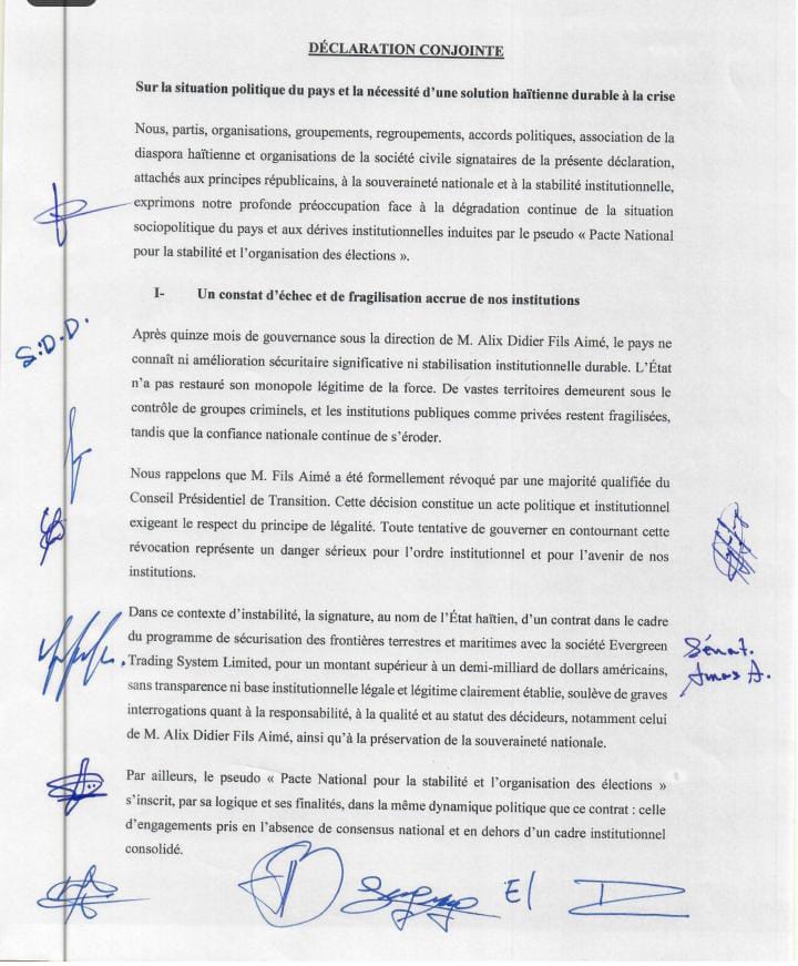 Parmi les personnalités ayant signé le document figurent Jonas Coffy, ancien ministre du Commerce, Simon Dieuseul Desras, ancien président du Sénat, Leguenson Jules-saint de Chwazi Ayiti, Jean Hénold Buteau et Me Lucmane Delile, ainsi que d’autres acteurs politiques et sociaux.