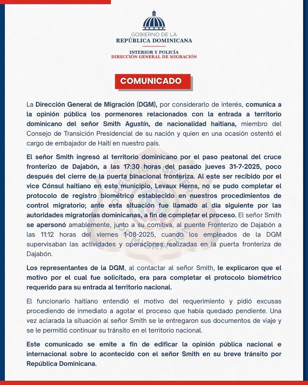 Dans un communiqué officiel publié le mercredi 06 juillet 2025, la Direction générale de Migration (DGM) de la République Dominicaine a apporté des précisions sur l’entrée sur son territoire du citoyen haïtien Smith Augustin, membre du Conseil présidentiel de Transition CPT et ancien ambassadeur d’Haïti en Dominicanie.
