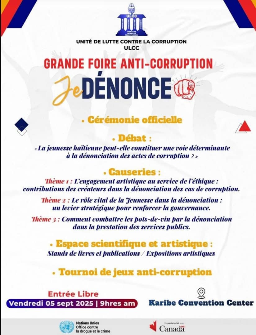 Ce vendredi 05 septembre 2025, l’Unité de Lutte contre la Corruption a organisé une grande foire anticorruption au Karibe Convention Center à Juvénat pour inciter la jeunesse à dénoncer la corruption sous toutes ses formes.