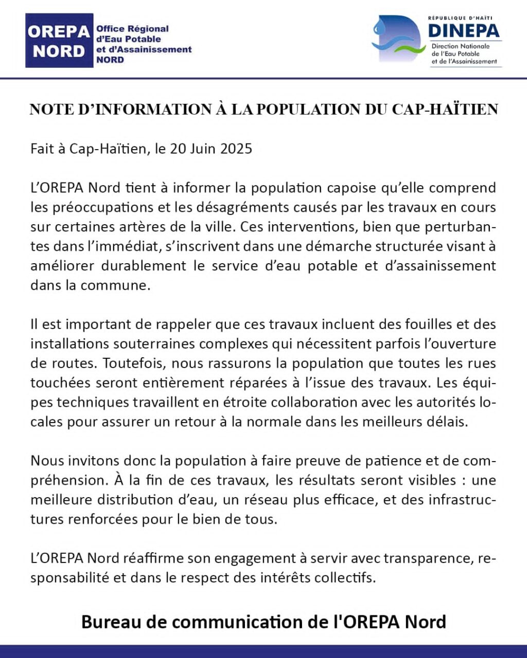 Face aux perturbations quotidiennes, l’OREPA Nord appelle les Capoises et Capois à faire preuve de patience et de compréhension. L’organisme promet des résultats tangibles à court terme : une distribution d’eau optimisée, un réseau d’assainissement plus efficace et des infrastructures renforcées pour répondre aux besoins croissants de la population.