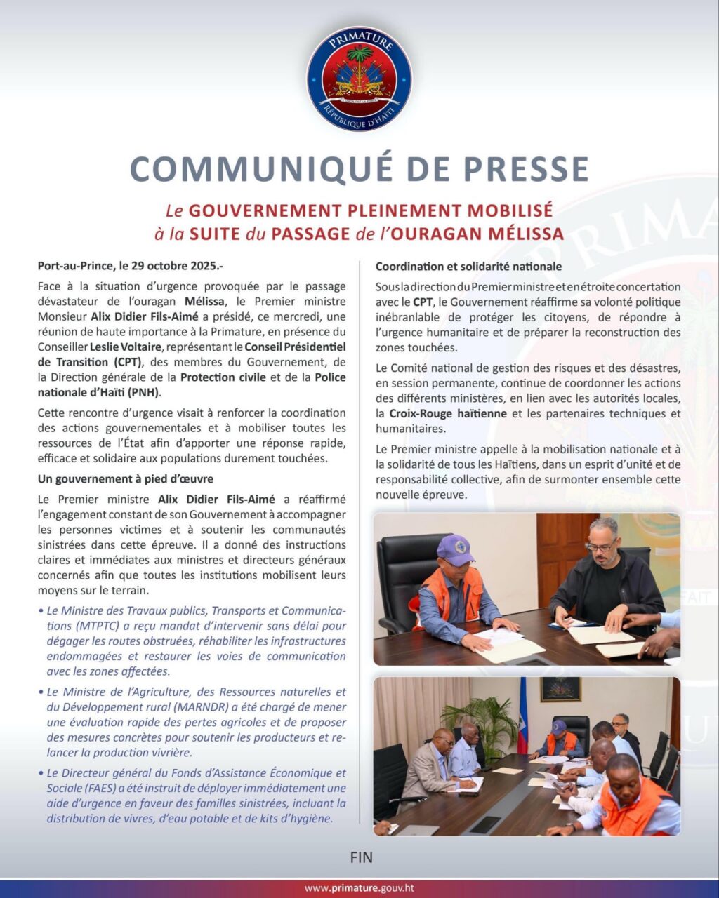 Sous la direction du Premier ministre, et en concertation avec le CPT, la Croix-Rouge haïtienne et les partenaires techniques et humanitaires, le gouvernement affirme sa détermination à répondre efficacement à la crise et à préparer la reconstruction des zones touchées.