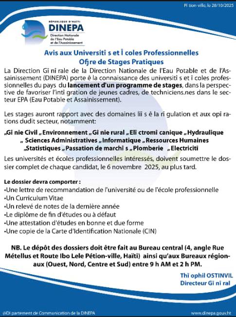 Les intéressés sont invités à soumettre leur candidature au bureau central de la DINEPA ( 4, angle rue Métellus et route Ibo Lele, Pétion ville, et au bureaux régionaux ( ouest, Nord, Centre et Sud), au plus tard le 6 novembre 2025.