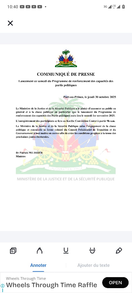 Le Ministère de la Justice et de la Sécurité publique (MJSP) a annoncé le lancement, ce samedi 1er novembre 2025, d’un programme de renforcement des capacités à l’intention des partis politiques. La cérémonie d’ouverture se tiendra au Karibe Convention Center à partir de neuf (9) heures du matin, où les représentants des formations politiques sont invités à s’enregistrer.