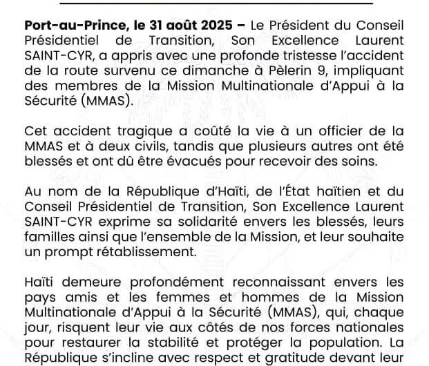 Le Président du Conseil Présidentiel de Transition, M. Laurent Saint-Cyr, s’est dit profondément attristé par la nouvelle...