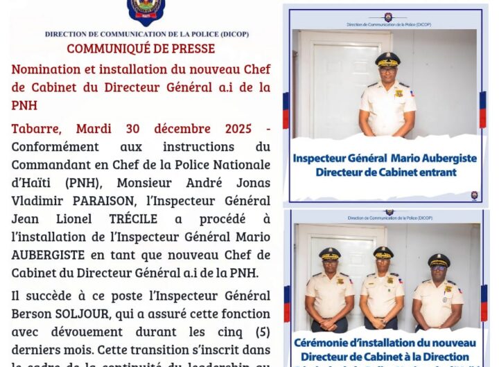 La Police nationale d’Haïti (PNH) a procédé, ce mardi, à l’installation de l’Inspecteur général Mario Aubergiste au...