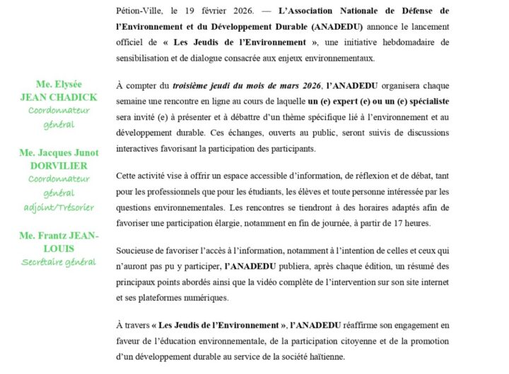 L’Association nationale de Défense de l’Environnement et du Développement durable (ANADÉDU) a annoncé le lancement officiel de...