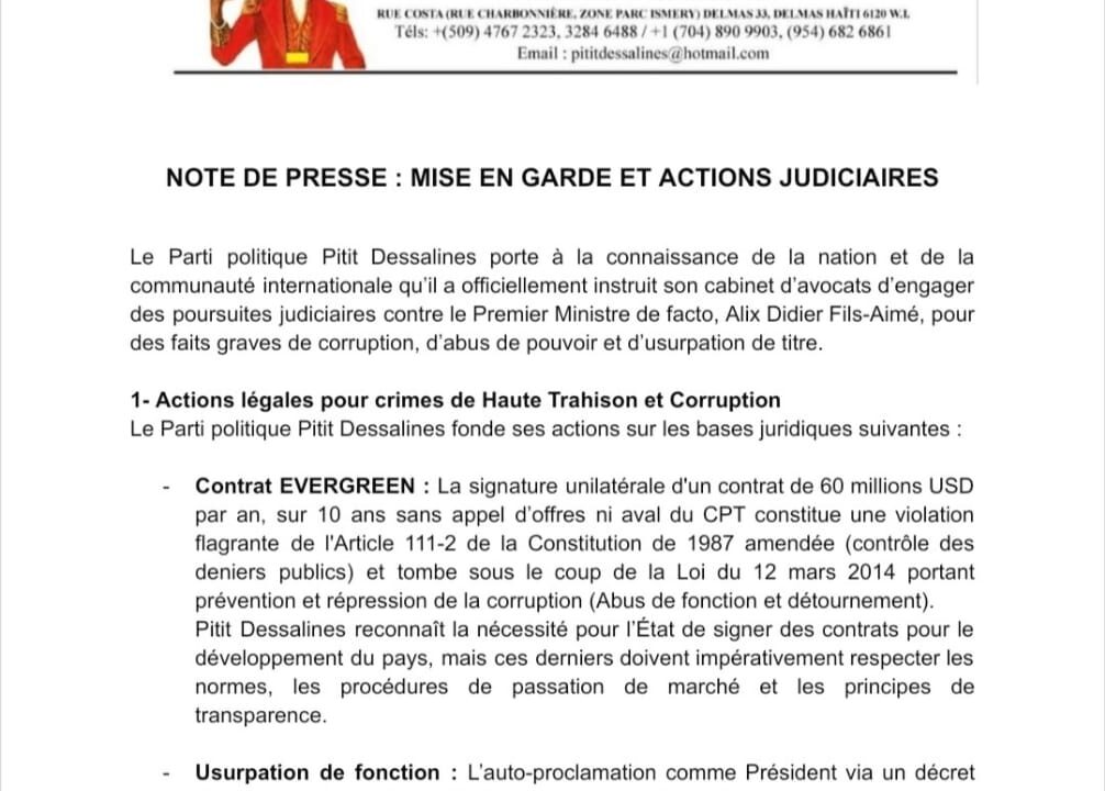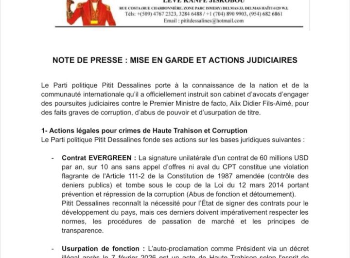Port-au-Prince, 20 février 2026 . Le parti Pitit Dessalines annonce des poursuites judiciaires contre le Premier ministre...