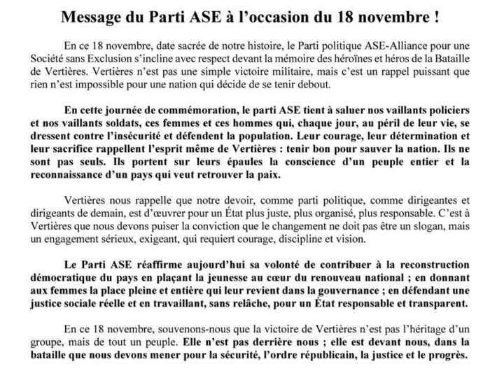 À l’occasion de la commémoration de la bataille de Vertières, ce 18 novembre 2025, le Parti politique...