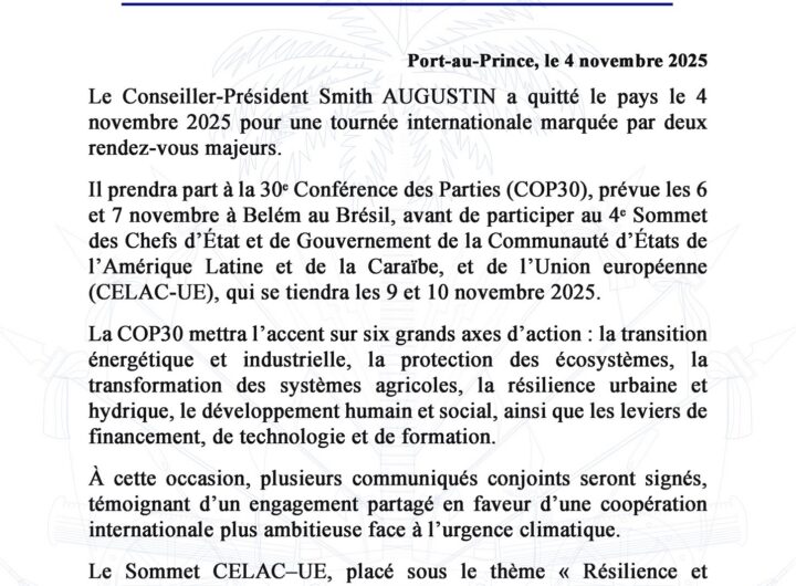 Port-au-Prince, le 5 novembre 2025 – Selon un communiqué officiel de la Présidence, le Conseiller-Président Smith Augustin...