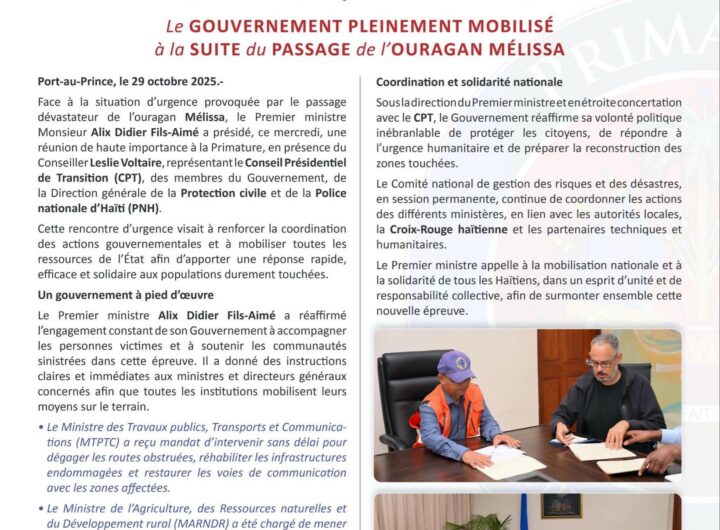 Confronté aux dégâts majeurs causés par l’ouragan Mélissa, le Premier ministre Alix Didier Fils-Aimé a convoqué ce...